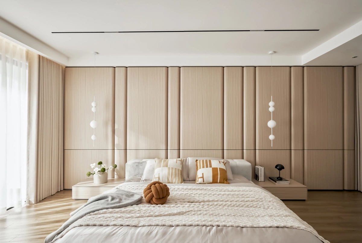 Nội thất phòng ngủ cũng mang tone màu đồng nhất với phong cách thiết kế chung của công trình.