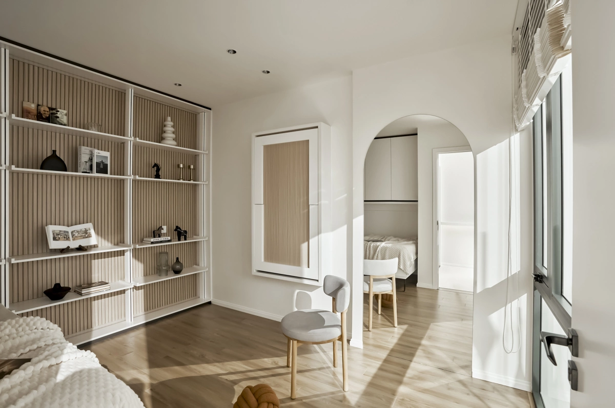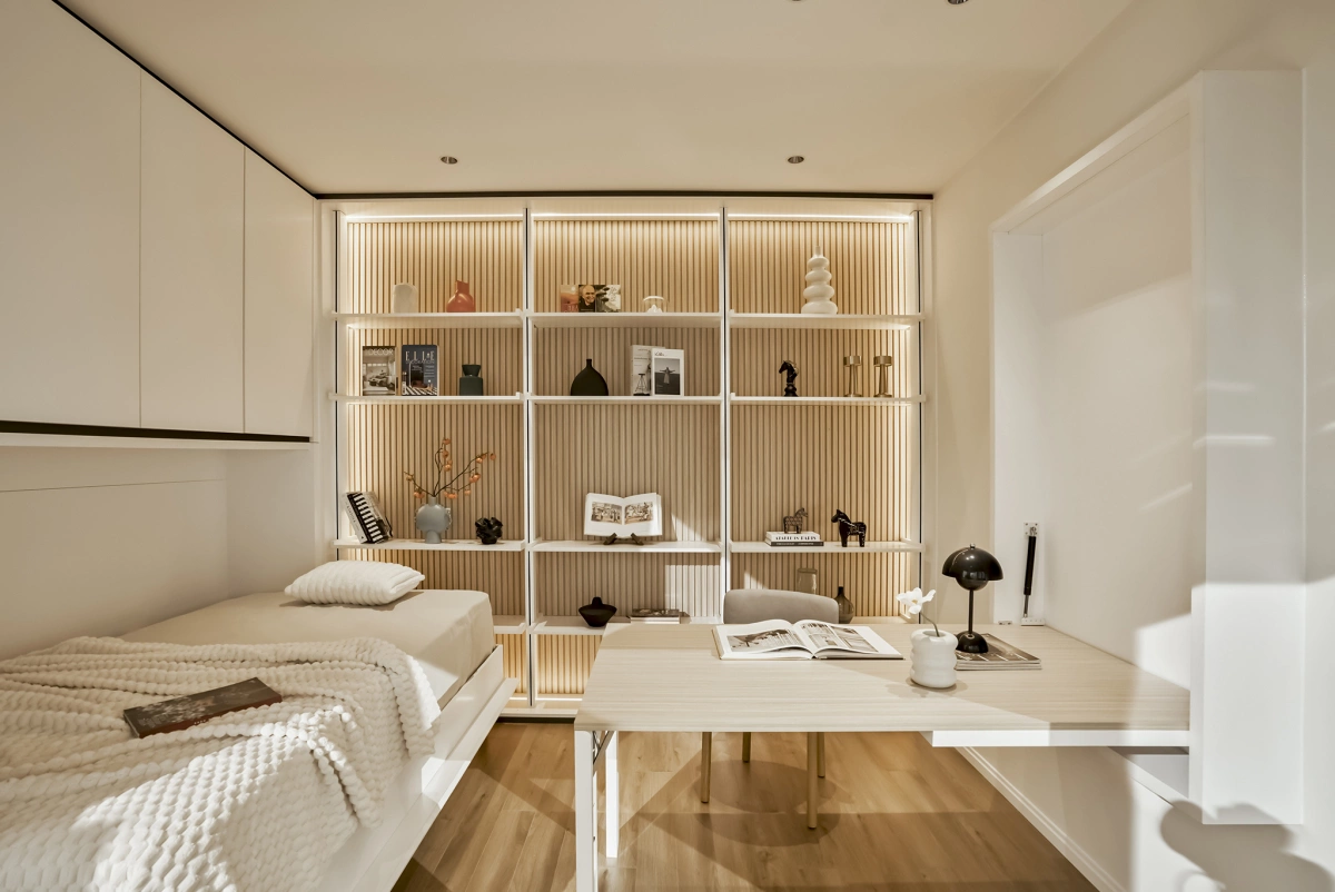 Giường ngủ cũng được thiết kế thông minh, gấp lại dễ dàng khi cần không gian trống.