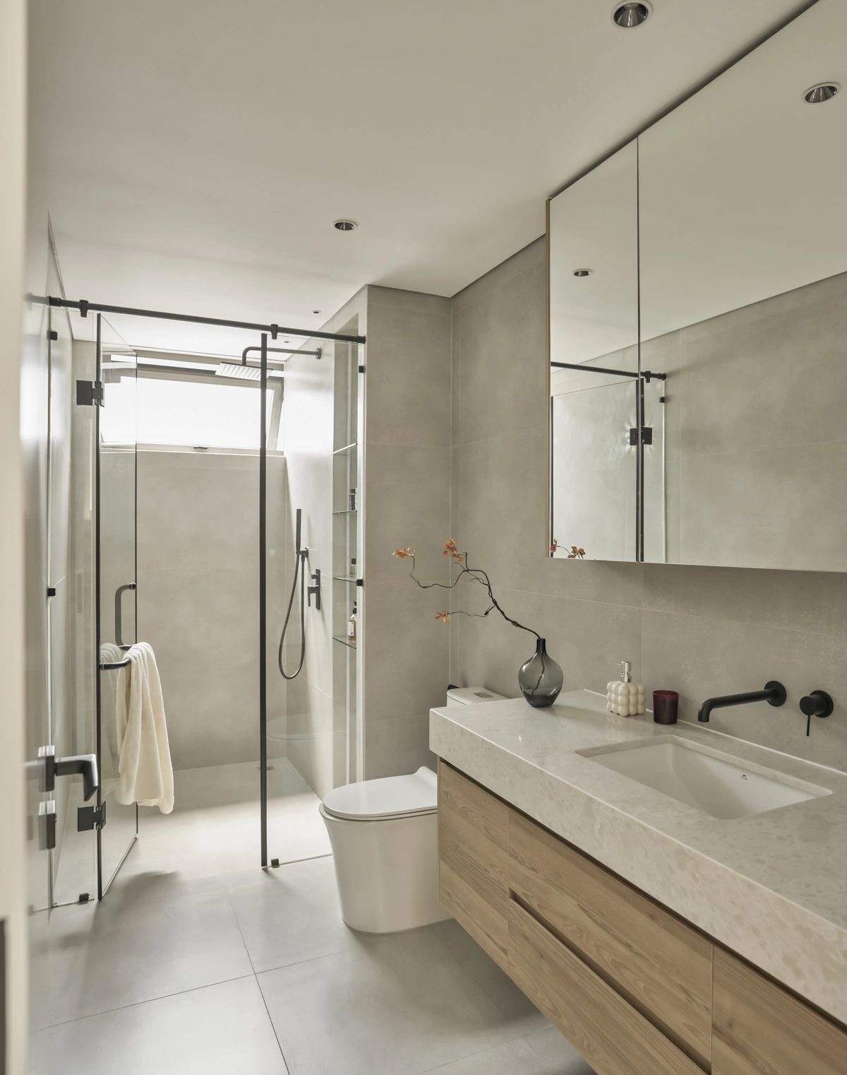 Phòng vệ sinh có bổ sung ô thoáng để lấy sáng và đối lưu không khí tốt.