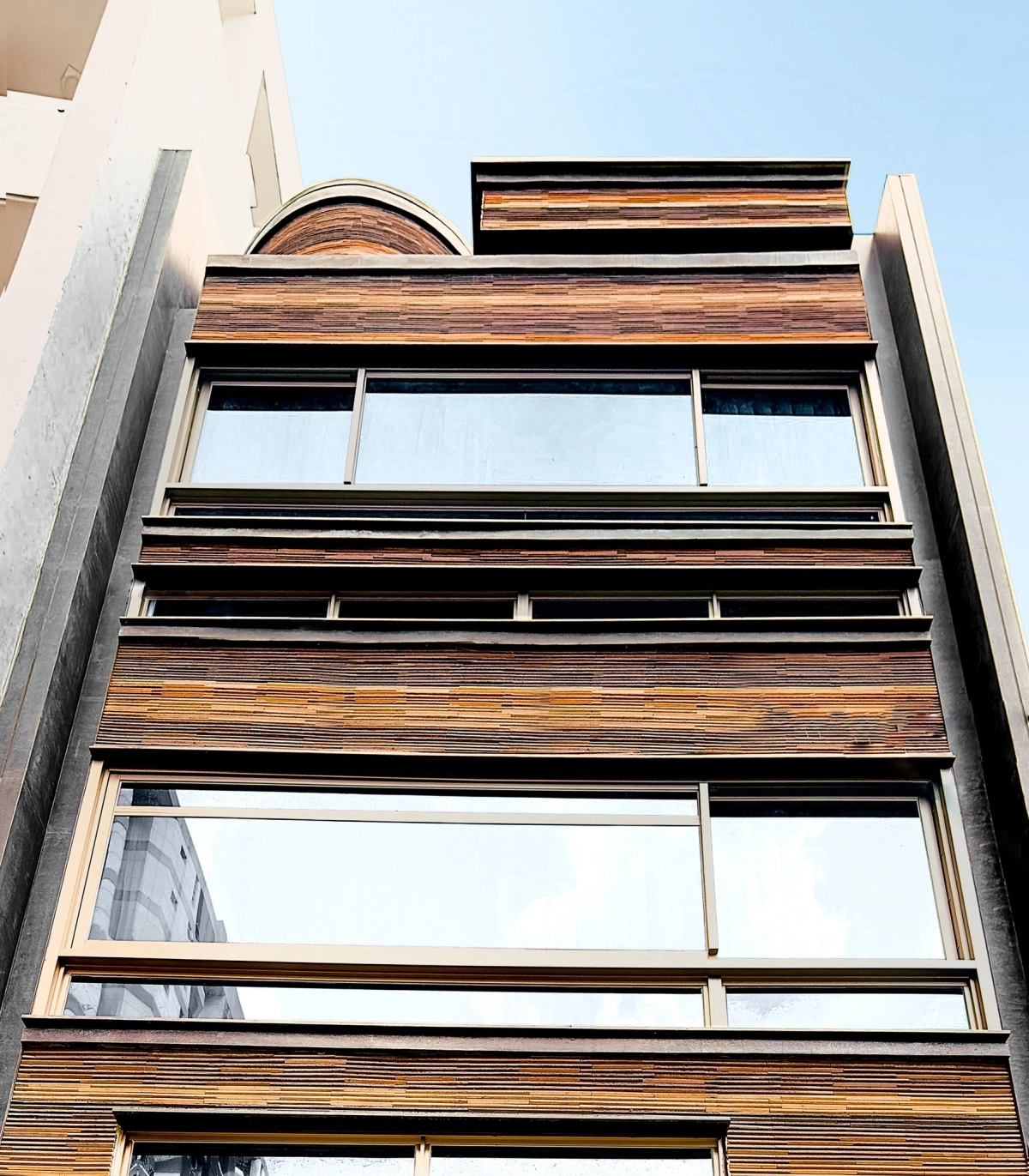Toàn bộ mặt tiền được ốp gạch thẻ Mosaic để tạo điểm nhấn, kết hợp vách kính để tối ưu tầm nhìn và ánh sáng tự nhiên.