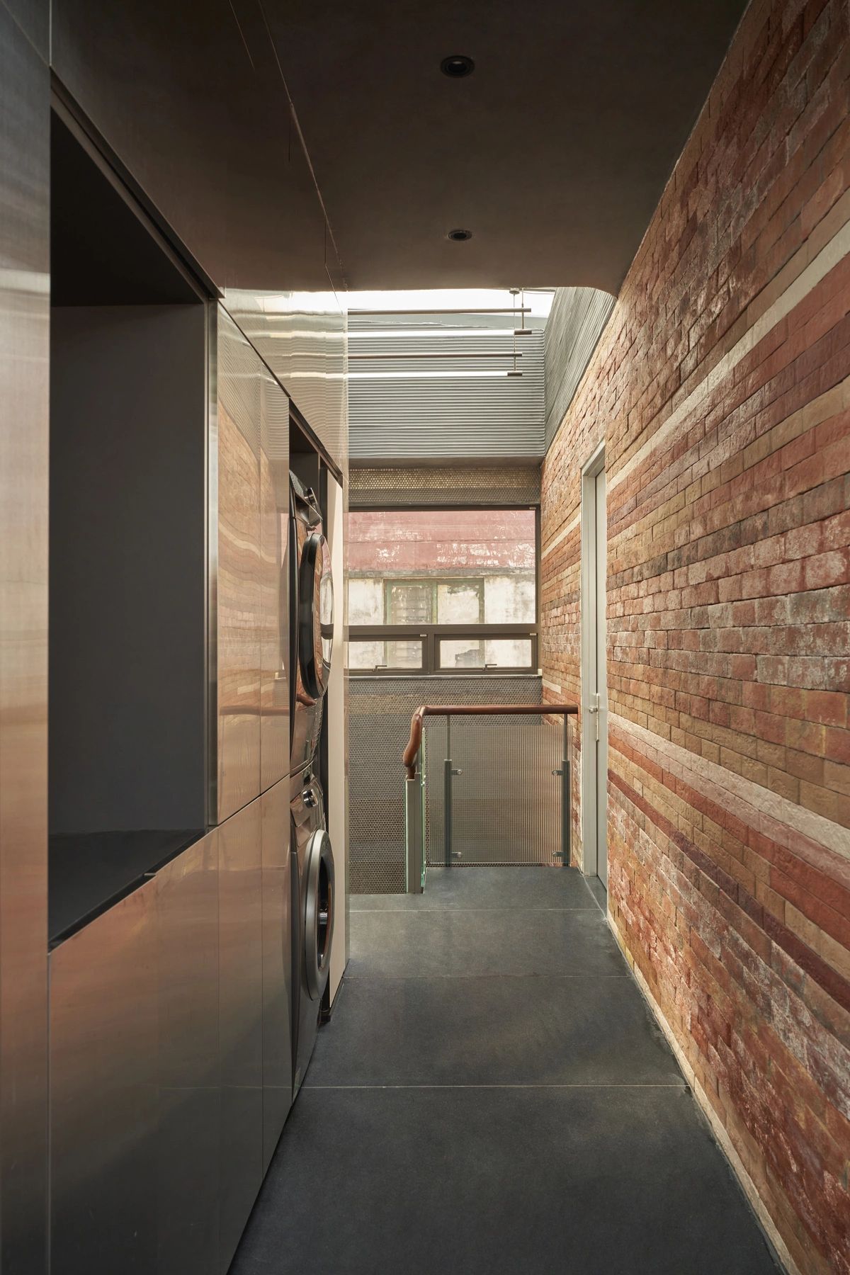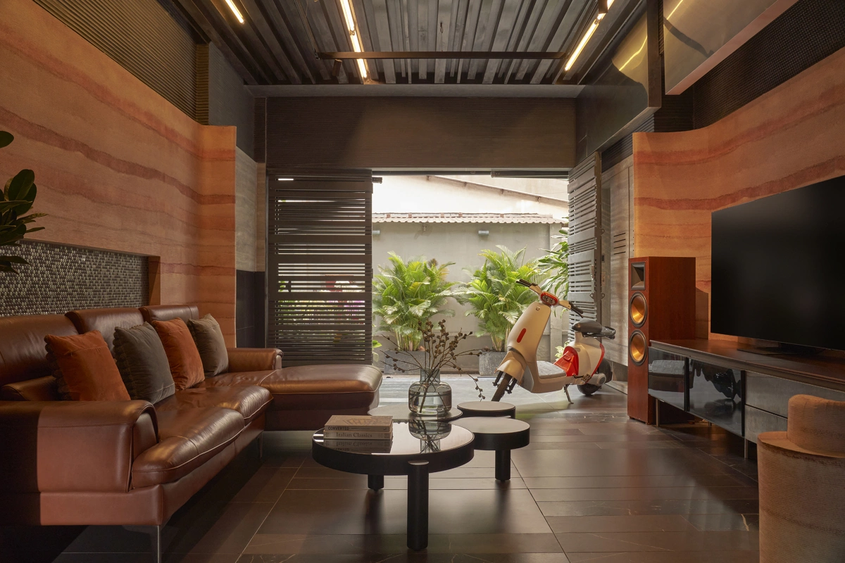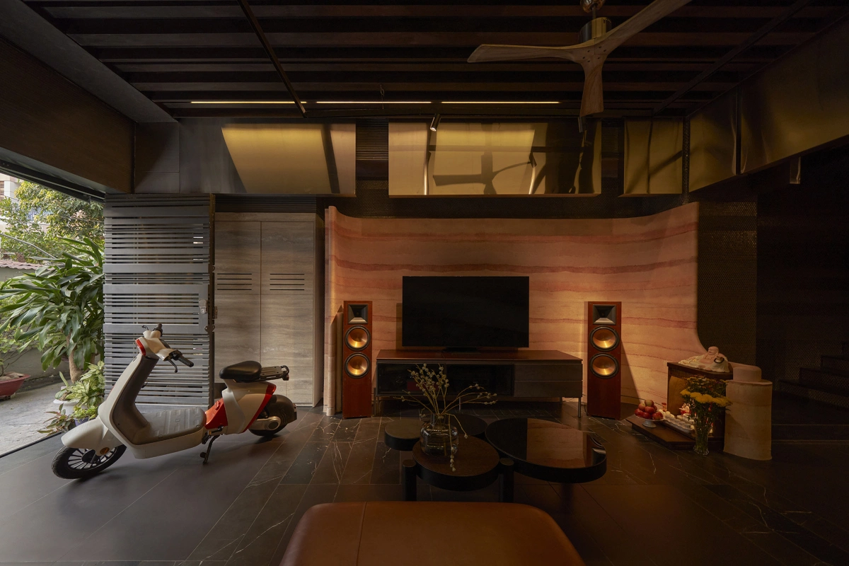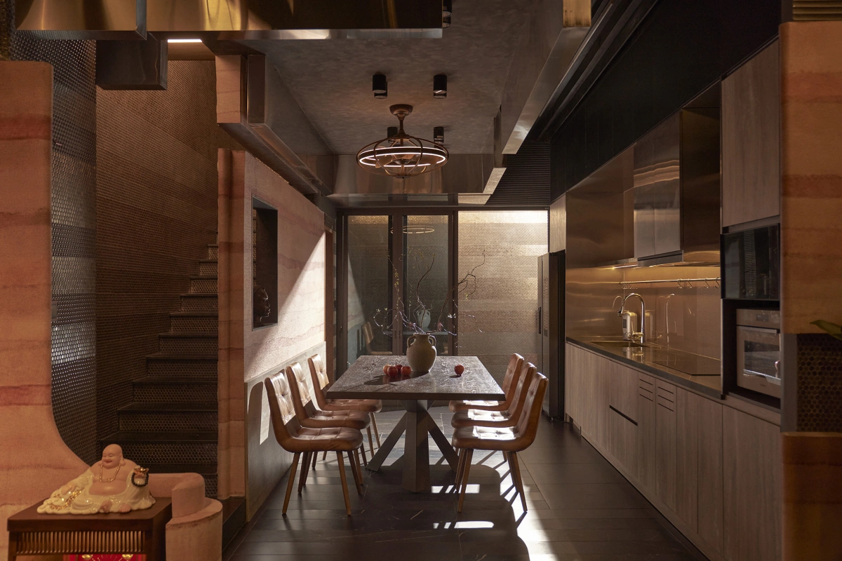 Màu đỏ cam của bazan được kết hợp với tone trầm tối của tổng thể, cùng với những bề mặt và chi tiết kim loại đã đẩy toàn bộ không gian trở nên khác biệt.